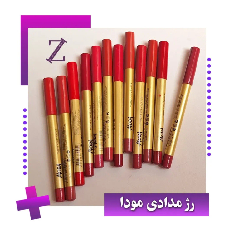رژ مدادی مودا ماندگاری بالا بافت نرم و روان جلوهای مات و جذاب در دو طیف رنگی نودگوشتی و آلبالوییگوجهای (رنگها شبیه هستن ولی یکی نیستن)